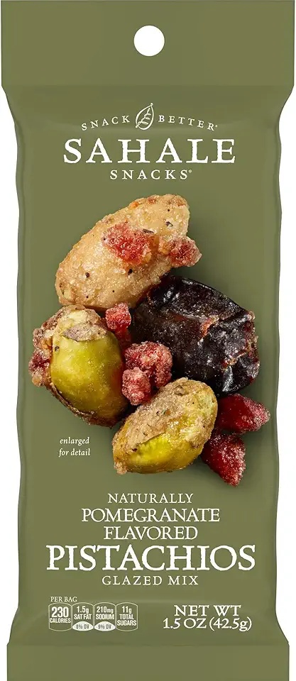 Sahale Snacks Pomegranate Flavored Pistachios Glazed Mix – 1.5 oz, pack of 9. Sweet-tart pomegranate glazed pistachios blended with premium nuts. Non-GMO, kosher, and gluten-free snack.