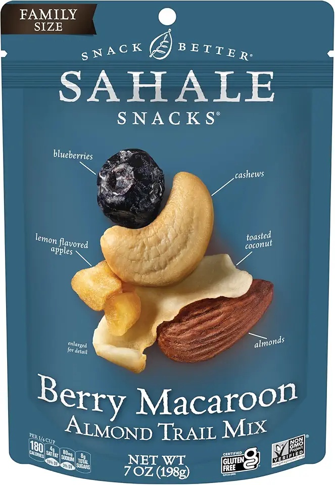 Sahale Snacks 7 oz pouch – dry-roasted deluxe mixed nuts with coconut, blueberries, and apples. Non-GMO, kosher, and gluten-free trail mix. Generous size for sharing or longer snacking sessions.